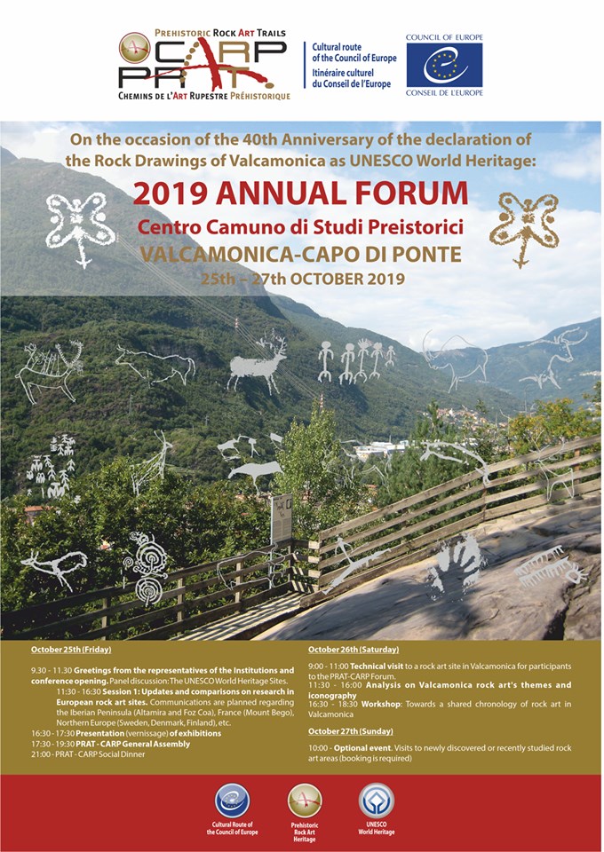 | 17:30 – 19:00 | Assemblea generale del PRAT – CARP Itinerari culturali del Consiglio d’Europa “Cammini dell’arte rupestre preistorica europea” (riservata ai soli iscritti) |