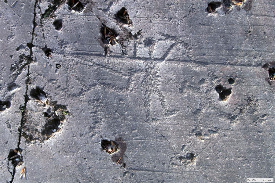 On the vast mounded surface there are also some symbols that are more difficult to locate, such as the so-called “Nadro temple”—a complex depiction of a construction with numerous symbols—and an erotic scene. Scattered here and there it is possible to find groups of other specific figures and themes—including birds, a graffitied Solomon’s knot, many square-bladed axes, shovels, footprints, North Etruscan lettering, and other hammer marks and graffiti.