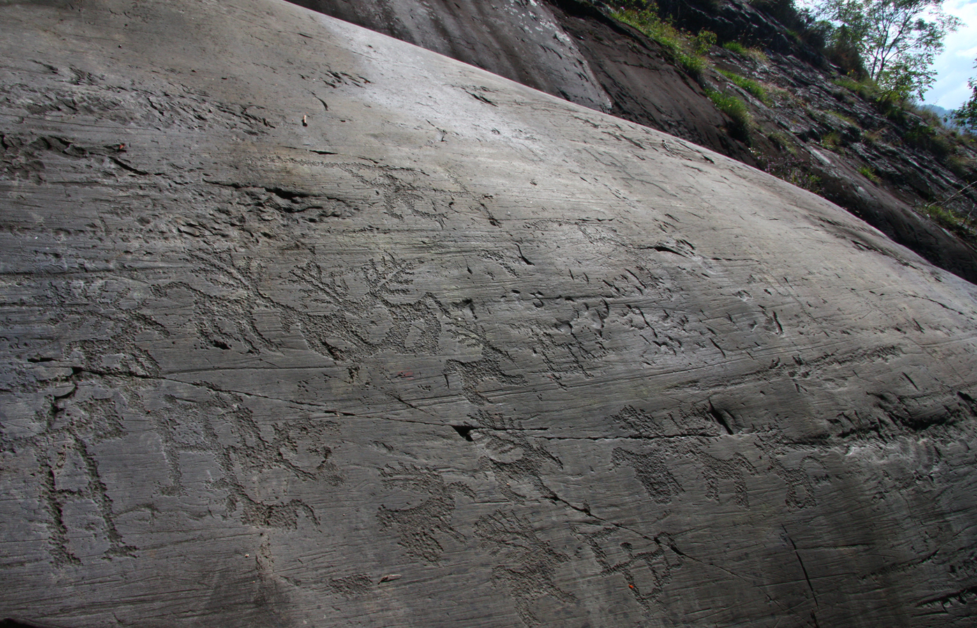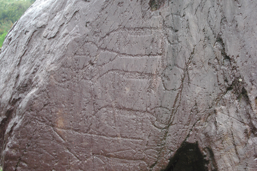 Its numerous engravings were made between the Middle and Late Iron Age and testify to the artistic apex reached by the Camunian people in this period. They are arranged over almost the entire surface of the rock and involve most of the known themes of the Camunian cycle, as well as several representations and scenes that can be defined as unique. In addition to warriors, many other characteristic themes are widely represented here, including a great number of hut figures and, above all, hundreds of footprints. There are also many bird figures (a recurring theme in the Foppe di Nadro area), while in the lower part of the rock there are some exceptional depictions—including five-pointed stars, inscriptions in the Camunian alphabet (a variant of the North-Etruscan alphabet) and two fight scenes (armed duel and boxing) in a naturalistic style.